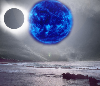 Genesis - Version 1 Created after my success with the 'Lone Star - version 5 image' , this is much like the 'Guardian - version 4' image in that it's an experiment in progress. I wasn't sure really what I wanted. The image of the water is actually a photo I took of the Puerto Rican coast a few years back. I cut the original sky from the image and applied a color variation and lighting effect to give it the blue color it as so it would appear as though it was taken during a solar eclipse. **the eclipsing sun is a common image found in Microsoft Windows. While the bright blue ball, is a NASA image of the Sun taken during a study of solar flare activity. |
